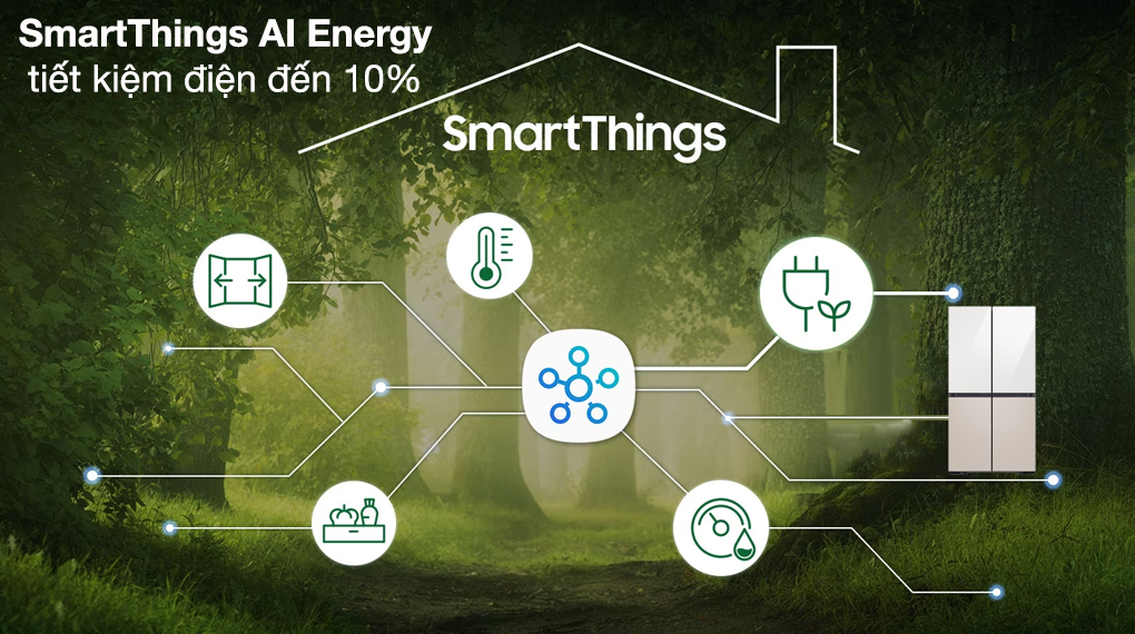 SmartThings AI Energy, công nghệ phân tích thói quen sử dụng tủ lạnh của gia đình bạn, ước tính lượng tiêu thụ điện dựa vào công nghệ trí tuệ nhân tạo Al. Khi hóa đơn chi phí điện của tủ lạnh vượt quá mục tiêu bạn đã đặt ra, thiết bị sẽ nhắc nhở để bạn chọn SmartThings AI Energy giúp tiết kiệm đến 10% điện năng.